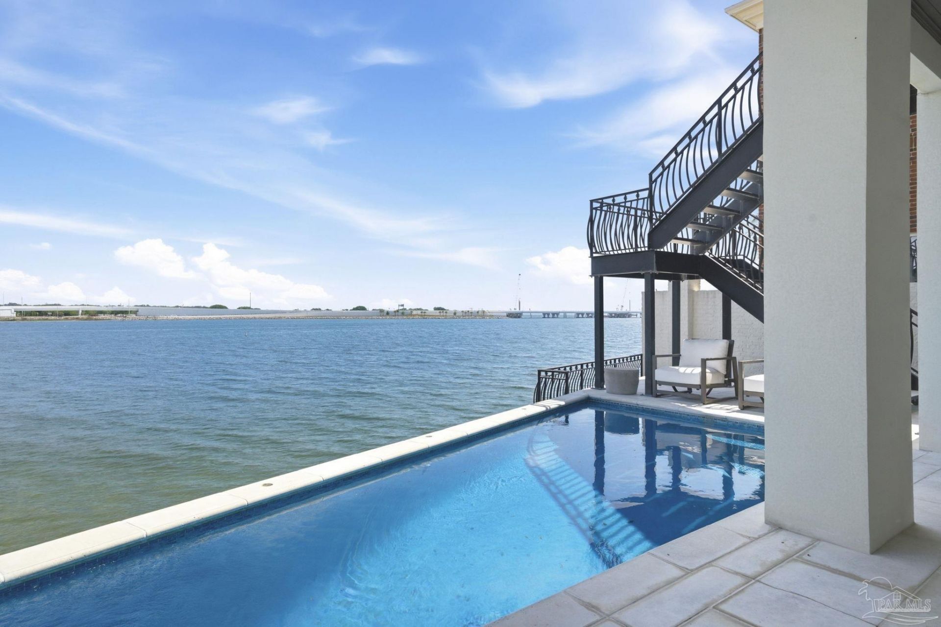 Anchoring the Downtown Pensacola bayfront, this 2018-built waterfront home is in like new condition and one of the few that truly delivers on both design and fortified construction. With approximately 8,000 square feet under roof (5,200+ heated and cooled, 1,400 of conditioned 4 car garage space, approximately 1500 sq. ft of covered and finished exterior decks). What sets it apart is what you don't always see. Concrete and 2x8 construction, a 50-year concrete tile roof by Boral, and built to full high-velocity wind zone standards. Up to 10 ft tall HVWZ High Velocity Wind Zone doors and windows from Kolbe & Kolbe which are engineered for up to 200 mph wind zone. Inside, a true chef's kitchen with Sub-Zero and Wolf appliances anchors the main living space, with a natural flow into dining and gathering areas. Additional spaces include a media room, a dedicated office custom designed for two, home gym with media access and beverage station overlooking heated infinity style pool and Pensacola bay. A large elevator services all 3 levels for convenience. Out back, the setup is impressive with 3 levels of entertaining space. Exterior features include a heated gunite pool, outdoor kitchen with new built in Coyote grill, Brick fireplace with media connections, framed by concrete and brick privacy walls. A whole-home 45kW gas generator is already in place. Out front unobstructed views of Pensacola Bay and Downtown Pensacola with no vacant lots or future homes to be built sets apart this particular properties location. Positioned at approximately 16 feet of elevation and located in an X flood zone, this is a true 30A style waterfront property that offers exclusivity and enjoyment of downtown Pensacola including restaurants, shopping and community events. This small community of only 13 parcels offers a rare combination of exclusivity and privacy.